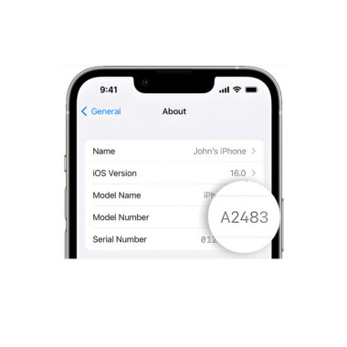 Go to Settings > General > About. To the right of Model Number, you'll find the part number. To find the model number, tap the part number. \n