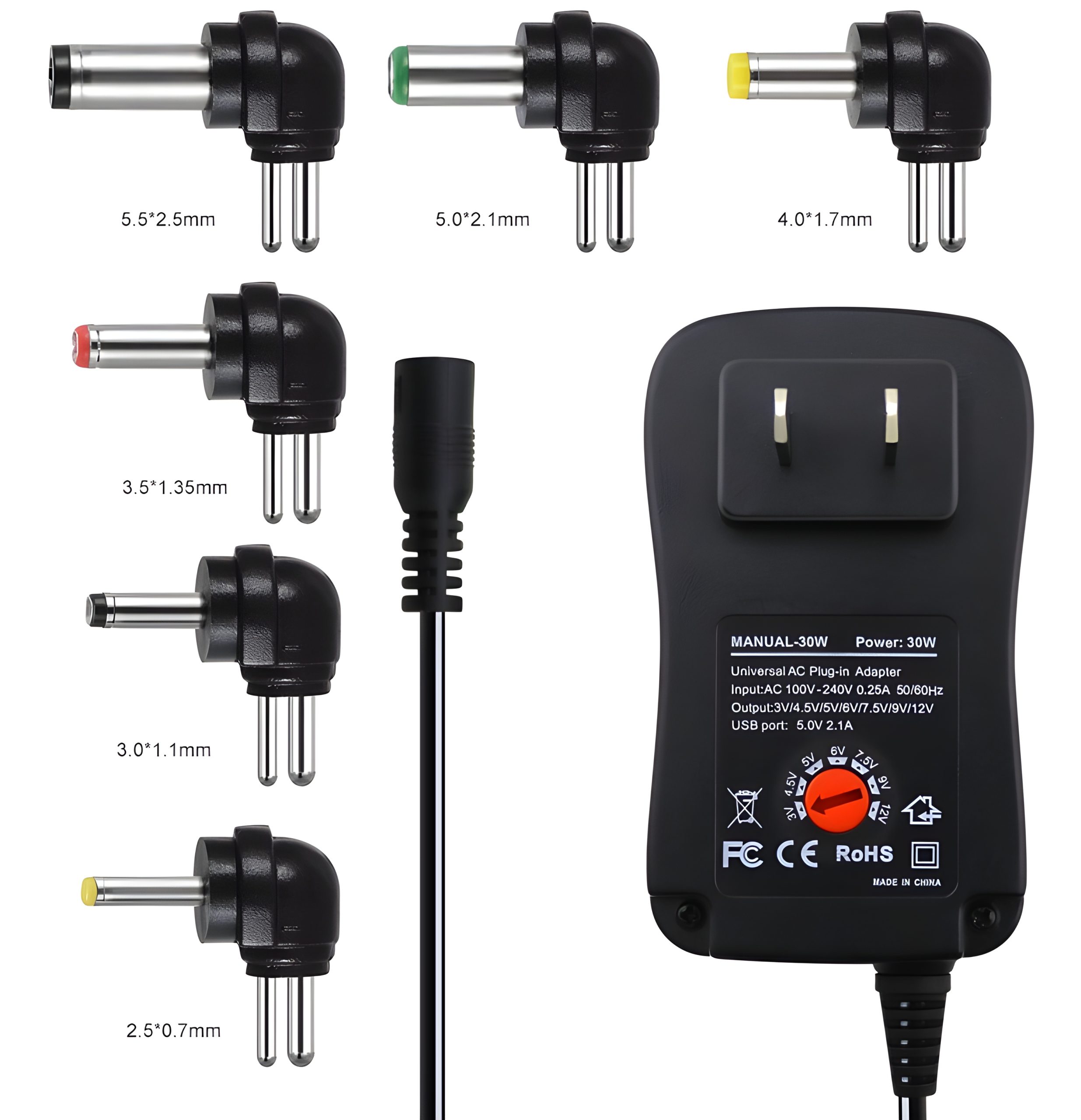- Universal Wall Charger Adapter AC/DC 3V 4.5V 5V 6V 7.5V 9V 12V with 6 Connector DC tip with 5V 2.1A USB Port