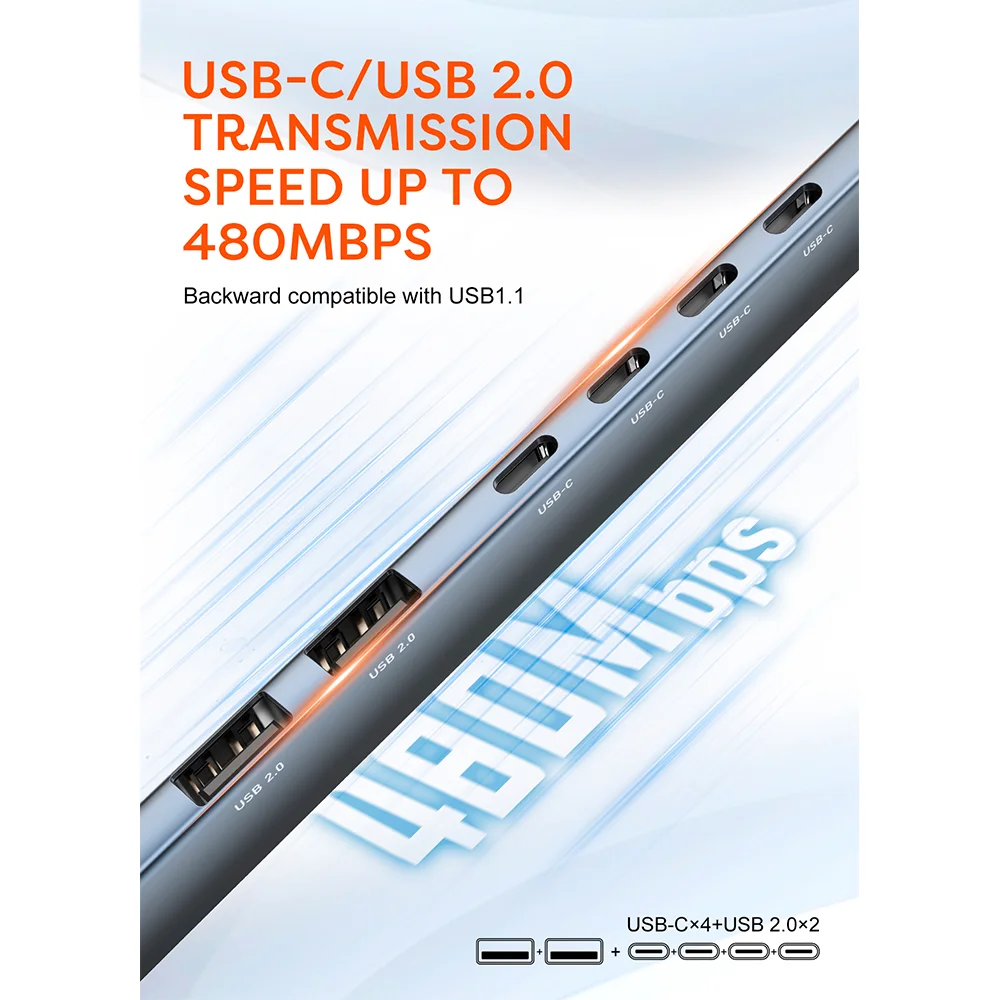 7 in 1 USB Hub Adapter, USB to USB 3.0×1 + USB-C 2.0×4 + USB 2.0×2, Plug & Play