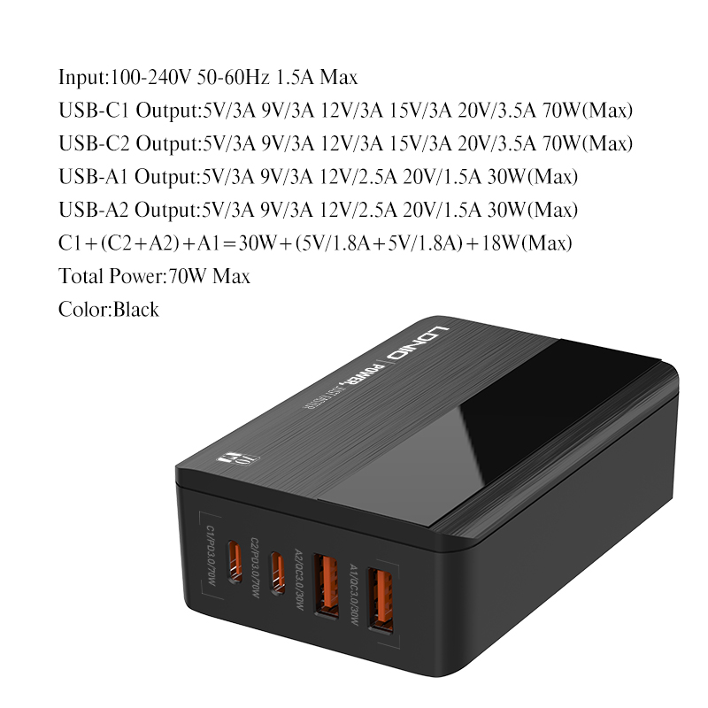 - 4 Ports 70W High Output Power USB-C PD QC4.0 Smart Charger Multi Port Mobile Phone Laptop Desktop Dock Fast Charger