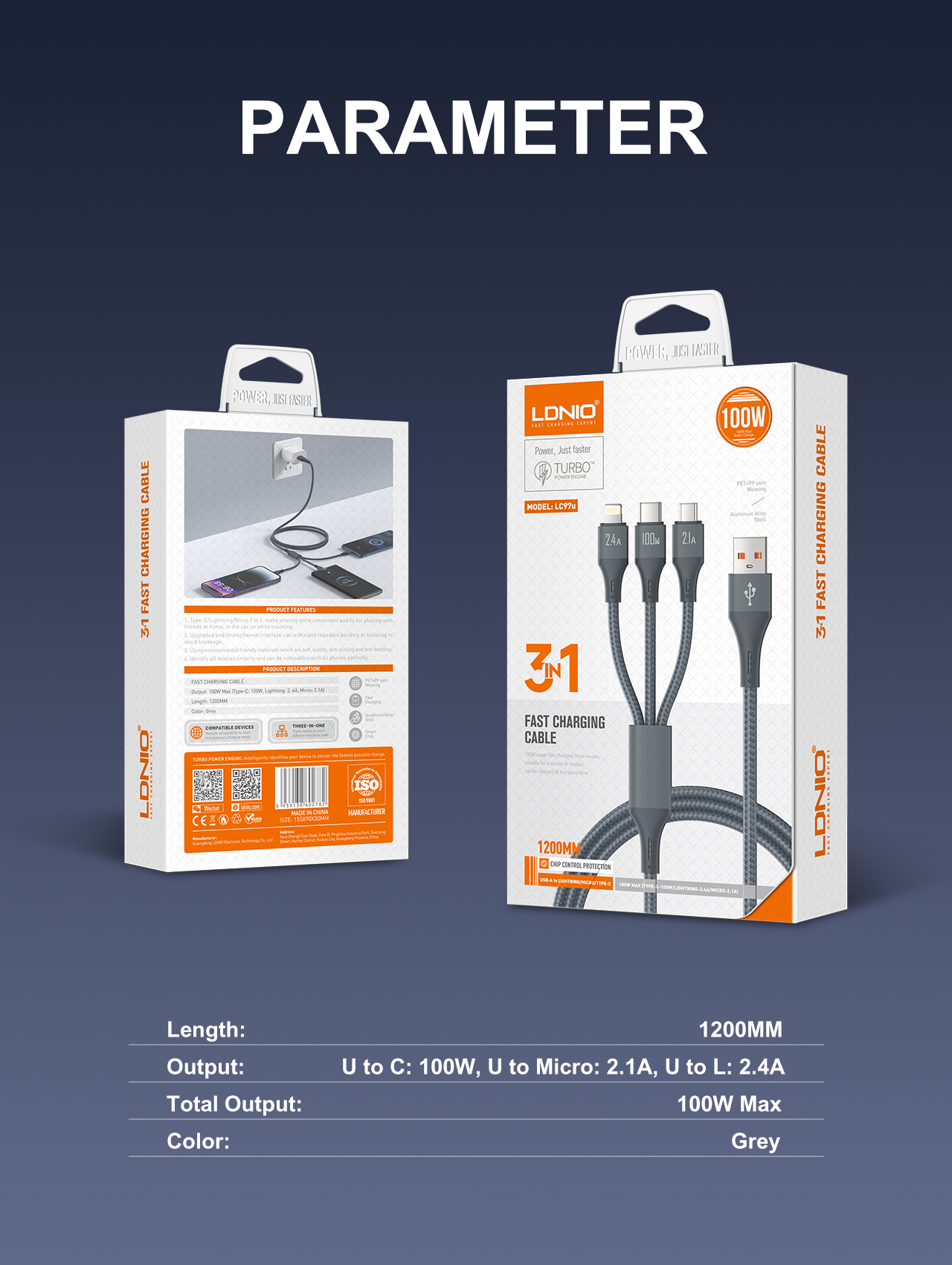 - Product name: 100W Super Fast Charging 3 in 1 USB Cable